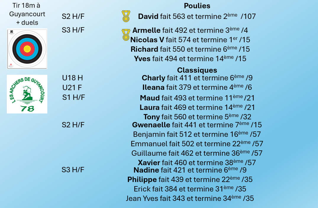 Vous trouverez tous les résultats de Guyancourt ici : https://www.ianseo.net/Details.php?toId=24879
